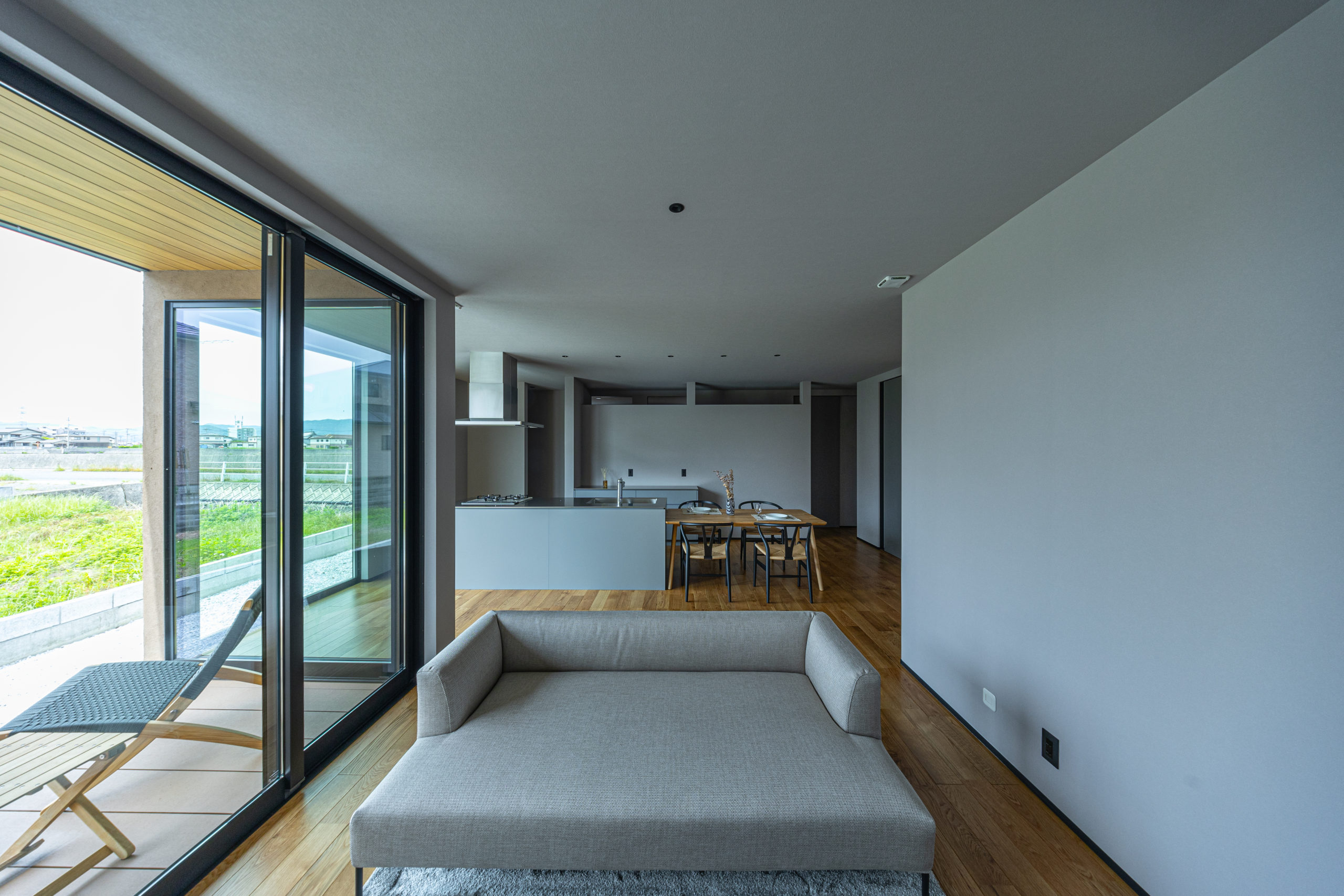 「平屋は部屋が暗くなりそう…」という心配をされる方もいますが、設計次第で2階建て以上の開放感をつくることが可能です。 例えば、屋根の形状を活かした「勾配天井」にすることで、リビングに圧倒的な開放感をもたらします。さらに、 外と内を繋げやすいのも平屋の強み。LDKからフラットに続くウッドデッキを設ければ、週末のBBQやティータイムも特別な時間になります。また、平屋の場合 どこの部屋にいても家族の気配がゆるやかに伝わり、自然と会話が生まれるのも素敵なポイントです。
