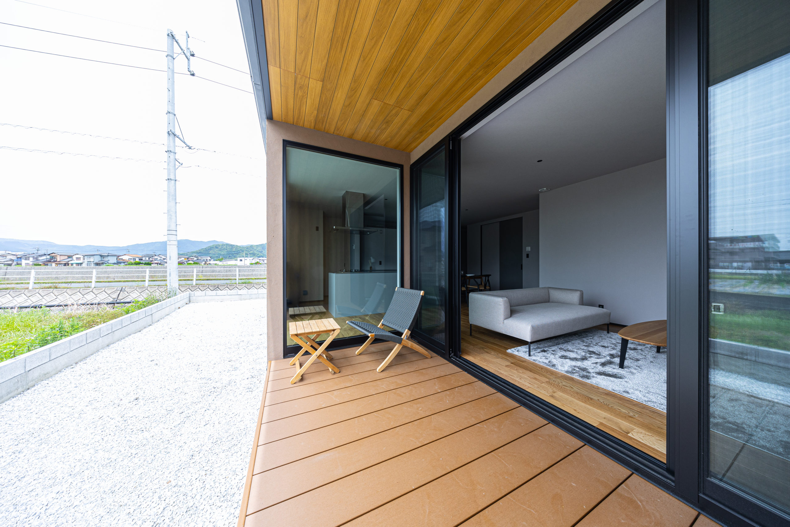 行橋市東大橋 平屋モデルハウス リビングダイニングとつながるウッドデッキ