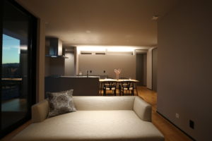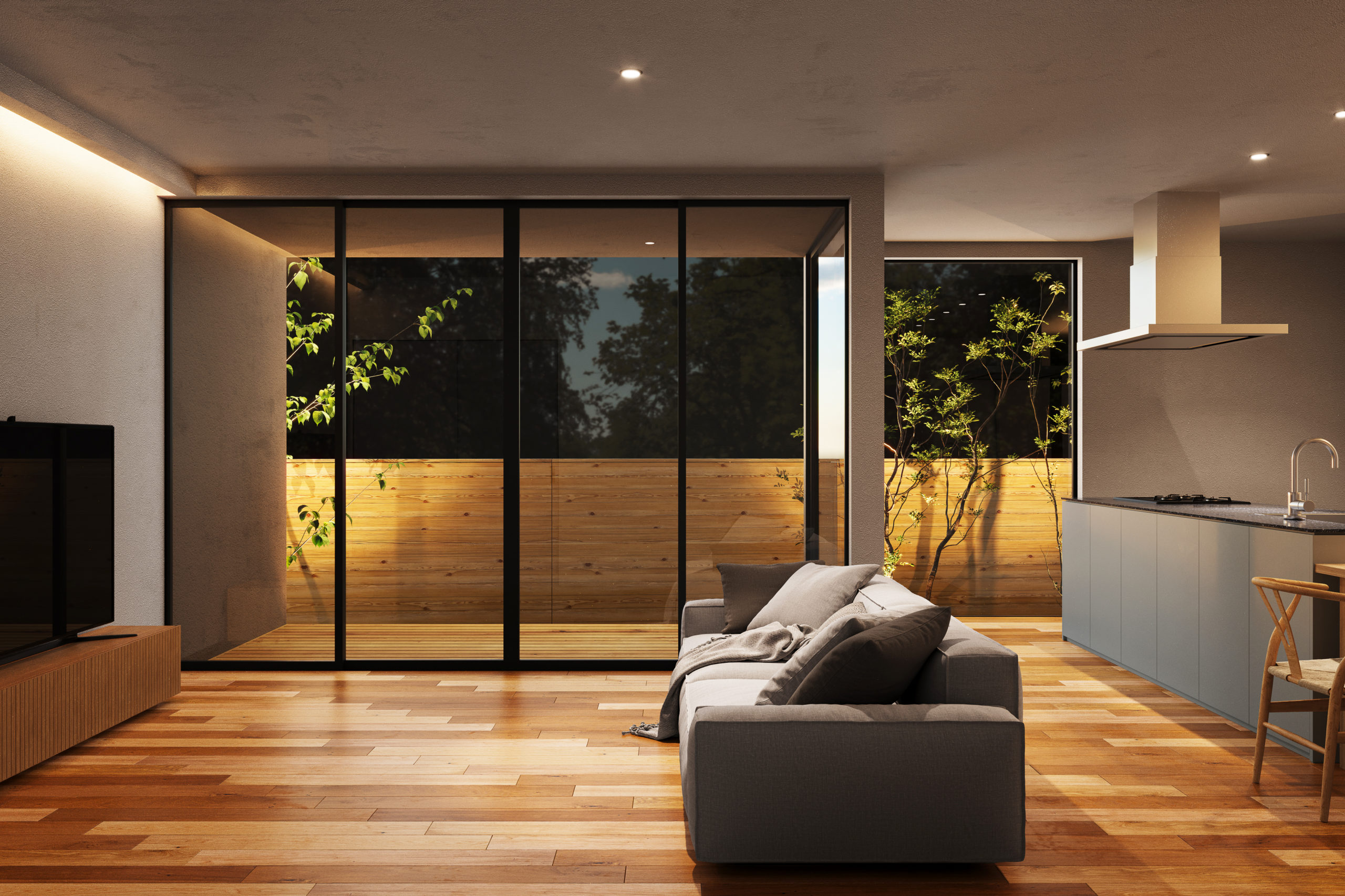 人通りの多い道路に面したファサードは、あえて窓を設けないことで高いプライバシーを実現しました。一転してリビングに足を踏み入れると、そこには外観からは想像もつかないほどの大開口が広がります。 美しい自然の風景を額縁のように切り取り、柔らかな光を呼び込む。プライベートを確保しながらもこの土地の豊かさを享受する、巧な設計です。