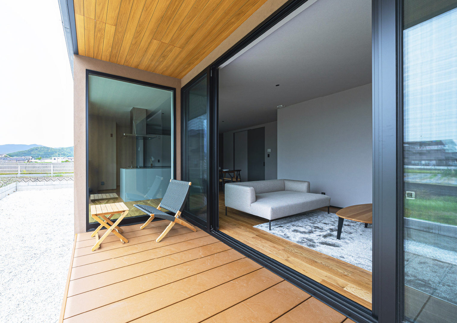 リビングの大開口からフラットに繋がるテラスは、まさに「もう一つのリビング」。 深くせり出した軒が、日差しや雨を優しく遮り、天候に左右されないくつろぎの時間を生み出します。リビングの延長として、あるいは四季の移ろいを肌で感じる場所として。空間の境界を曖昧にすることで、平屋ならではの伸びやかな暮らしを叶えました。